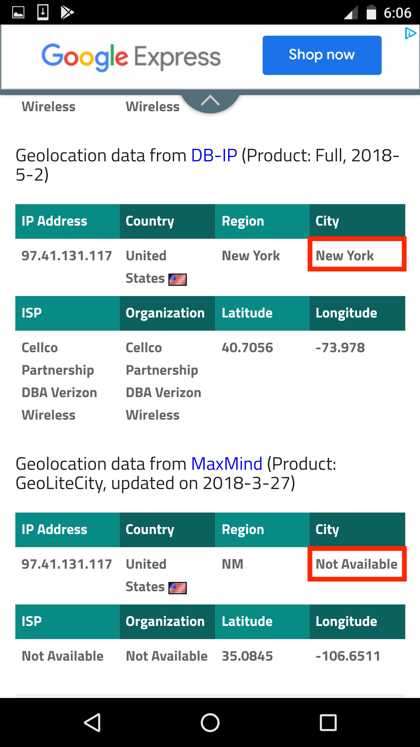 However, I get these alerts even when disconnected from WiFi, and when the geolocation information from multiple providers is contradictory at best and completely incorrect at worst. For example, on Wed, I got alerts for Mountain View when I was not connected to WiFi, and the GeoIP information ranged from Danville to San Jose.